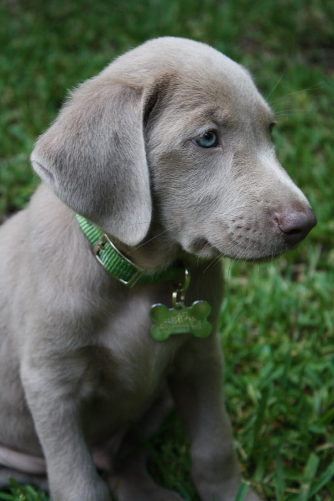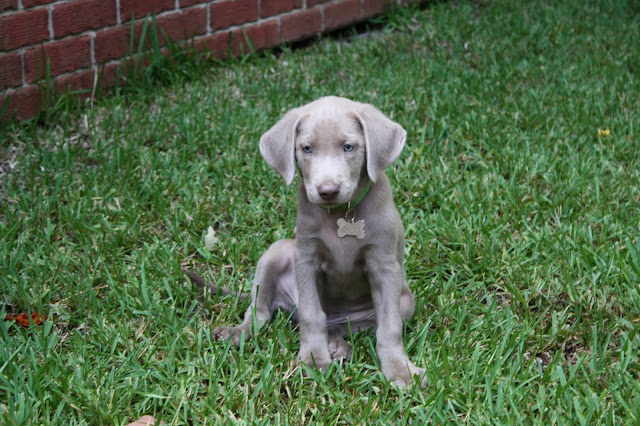What a darling! Looks just like our Weimaraner did as a puppy only with a long tail. I wonder if the blue eyes will turn amber like the weim's do?